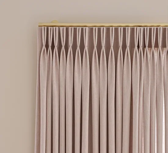 De wave-plooi geeft een strak en symmetrisch effect. De stof hangt in gelijkmatige golven over een speciale rail, wat zorgt voor een rustige en moderne uitstraling. Dit type plooi komt het best tot zijn recht bij soepel vallende stoffen en bij gordijnen die van plafond tot vloer reiken, bijvoorbeeld in een strakke leefruimte of moderne slaapkamer.